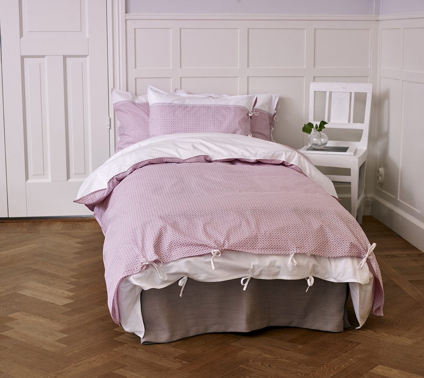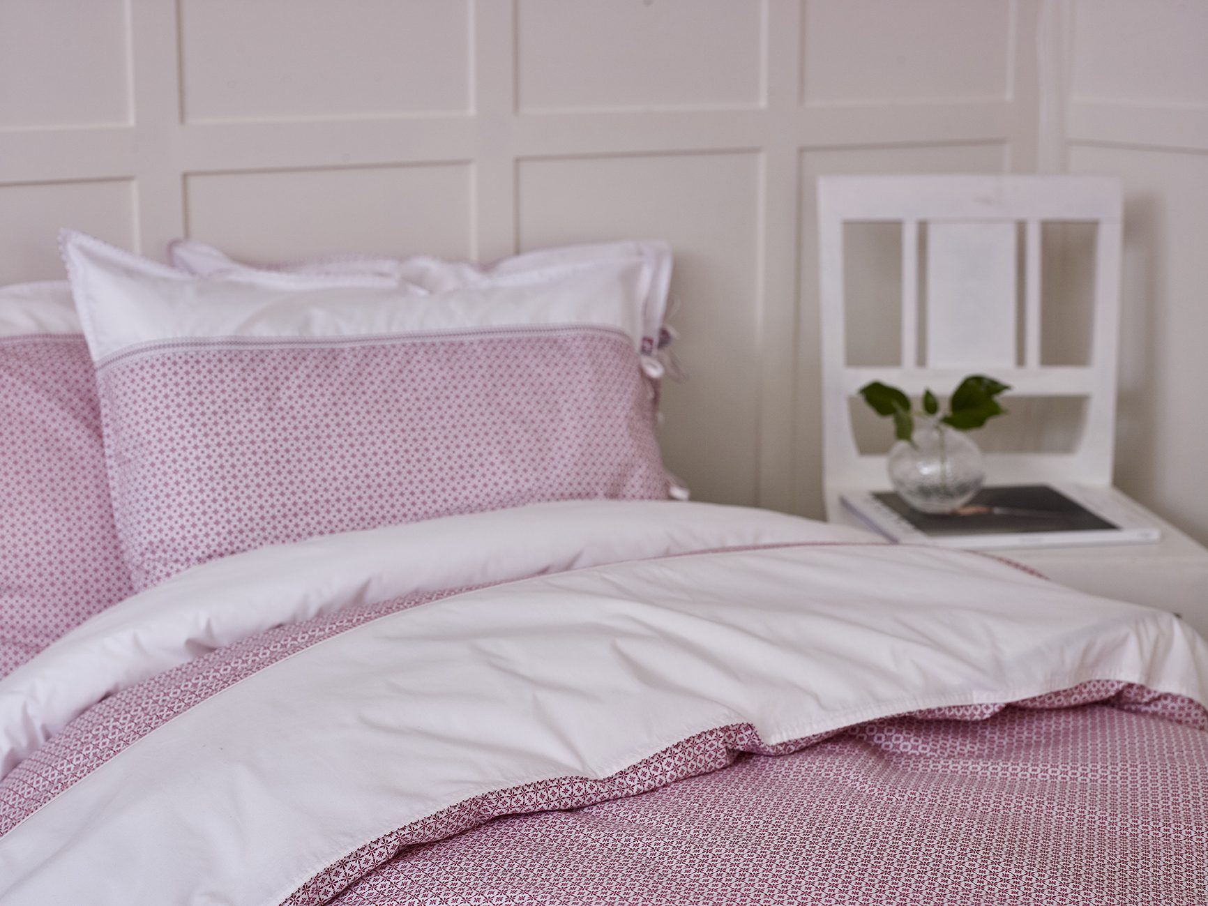 Påslakan i sval och långfibrig bomull. Tvåsidigt designat med en mönstrad sida och den andra mönstrad med ett vitt insytt parti och mönsterband upptill. Finns både som enkel och dubbel (King Size) modell.